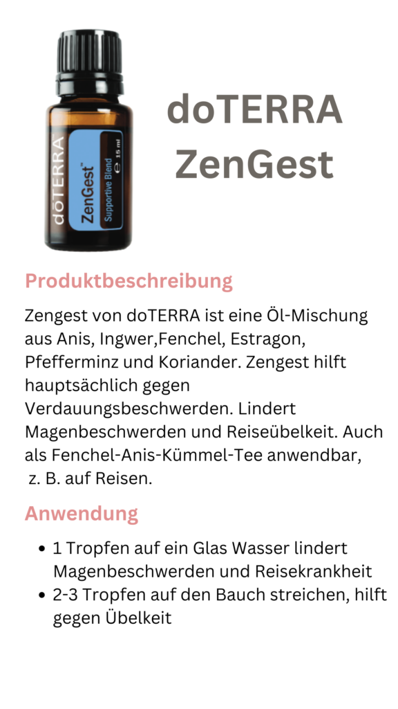 Reiseübelkeit oder Verdauungsbeschwerden können auftreten. Ätherische Öle wie Ingwer, Pfefferminze und ZenGest haben verdauungsfördernde Eigenschaften. Trage sie verdünnt auf den Bauch auf oder füge ein bis zwei Tropfen zu einem Glas Wasser hinzu.